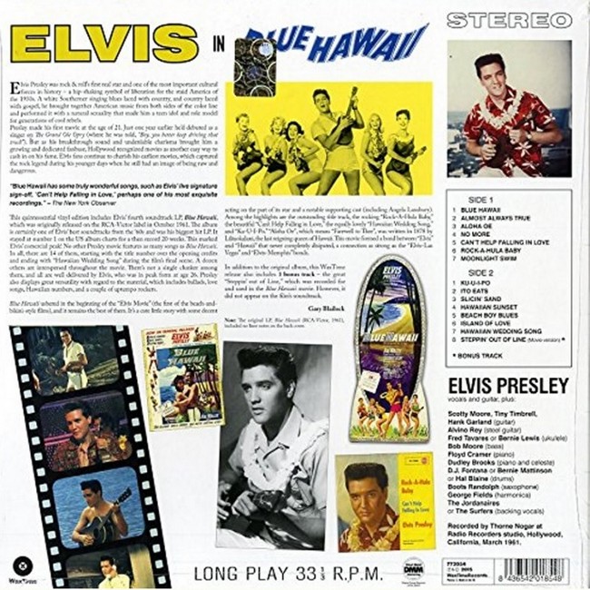 Фірмова вінілова платівка (VINYL)Blue Hawaii is the fourth soundtrack album by the American singer Elvis Presley, released on RCA Victor Records in mono and stereo, LPM/LSP 2426, on October 20, 1961. It is the soundtrack to the 1961 film of the same name starring Presley. In the United States, the album spent 20 weeks at the number one slot and 39 weeks in the Top 10 on Billboard's Top Pop LPs chart. It was certified Gold on December 21, 1961, Platinum and 2? Platinum on March 27, 1992, and 3? Platinum on July 30, 2002, by the Recording Industry Association of America.