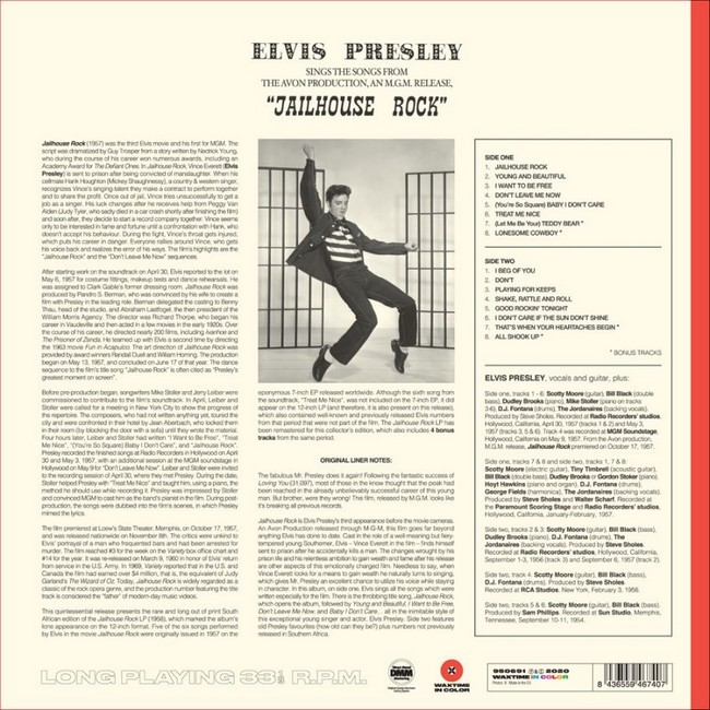 Фірмова вінілова платівка (VINYL)Jailhouse Rock is an EP by American singer Elvis Presley, featuring songs from the movie of the same name. It was released by RCA Victor, with catalogue EPA 4114, on October 30, 1957. Recording sessions took place at Radio Recorders in Hollywood on April 30 and May 3, 1957, with an additional session at the Metro-Goldwyn-Mayer Soundstage in Hollywood on May 9 for "Don't Leave Me Now". It peaked at #1 on the newly inaugurated Billboard EP chart where it remained at #1 for 28 weeks. The EP album was the best selling EP album of 1958 according to Billboard.