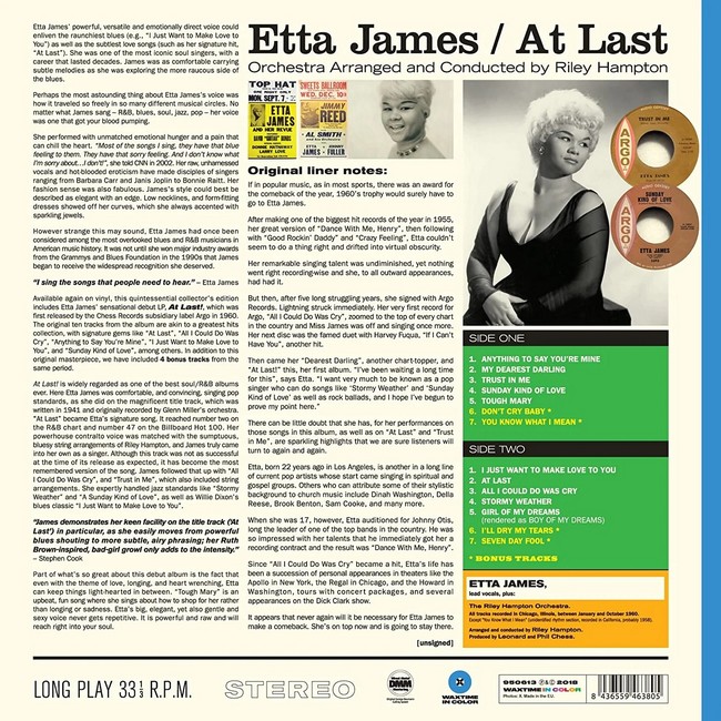At Last! is the debut studio album by American blues and soul artist Etta James. Released on Argo Records in November 1960 the album was produced by Phil and Leonard Chess. At Last! also rose to no. 12 upon the Billboard Top Catalog Albums chart.