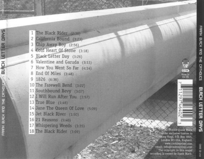Фірмовий CD диск (CD)Black Letter Days is the first of two albums by Frank Black and the Catholics simultaneously released in 2002 (along with Devil's Workshop). The title implies the opposite of the term "Red Letter Days" which are holidays – a "black letter day" being all the ordinary days in a given month.