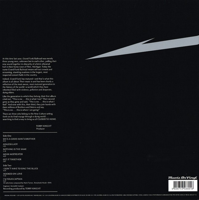 Фірмова вінілова платівка (VINYL)Closer to Home is the third studio album by American rock band Grand Funk Railroad. The album was released on June 15, 1970, by Capitol Records. Recorded at Cleveland Recording Company, the album was produced by Terry Knight. This album reached RIAA gold record status in 1970, making it the group's third gold record in one year. The album's inside artwork shows a live photo of the band performing at Madison Square Garden in February 1970.
