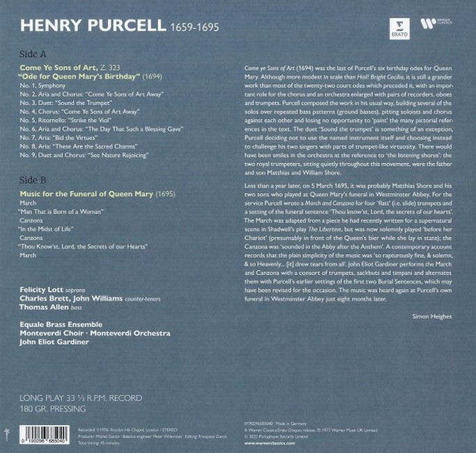 Фірмова вінілова платівка (VINYL)Come Ye Sons of Art, Z.323, also known as Ode for Queen Mary's Birthday, is a musical composition by Henry Purcell. It was written in 1694, and is one of a series of odes in honour of the birthday of Queen Mary II of England. The text of the ode is often attributed to Nahum Tate, who was poet laureate at the time.