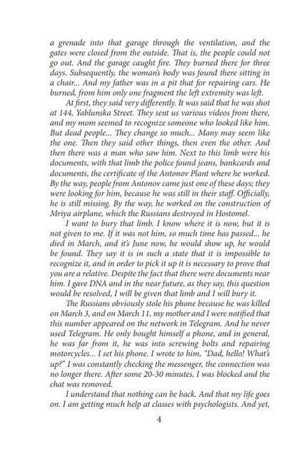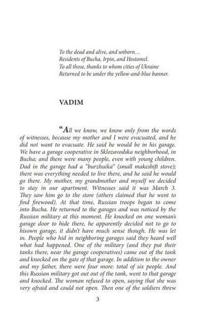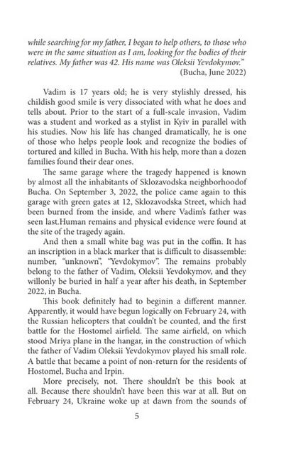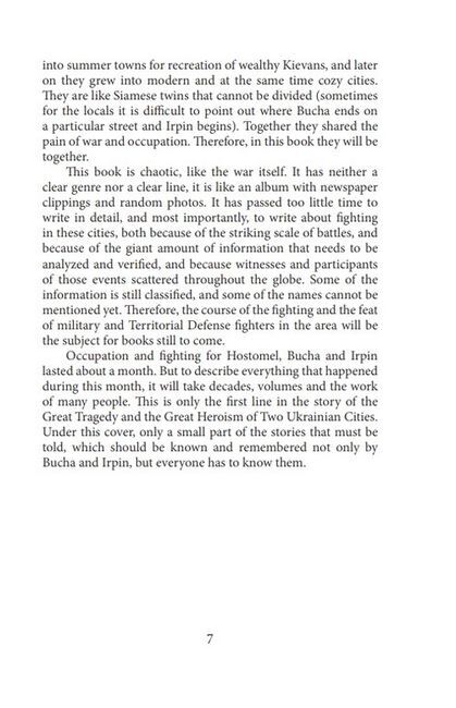 There shouldn’t be this book at all. Because there shouldn’t have been this war at all. But on February 24, Ukraine woke up at dawn from the sounds of explosions, and a convoy of Russian militaryvehicles crashed our past life with their grousers. The war has become our new reality, and air alarms become our everyday life. Bucha and Irpin have ceased to be associated with forests, sanatoriums and children’s summer camps, with a hasteless life of the outskirts of the capital. Now, the very names of these cities are nailing with pain all those who have never even been there. But along with evil and pain, throughout the days of the war, in these frozen, frightened and bloodied cities, unprecedented heroism lived: soldiers, medical staff, rescuers, Territorial Defense fighters, citizens, everyone who helped, protected, rescued, and evacuated.