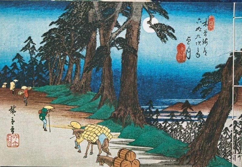 The Kisokaido route through Japan was ordained in the early 1600s by the country’s then-ruler Tokugawa Ieyasu, who decreed that staging posts be installed along the length of the arduous passage between Edo (present-day Tokyo) and Kyoto. Inns, shops, and restaurants were established to provide sustenance and lodging to weary travelers. In 1835, renowned woodblock print artist Keisai Eisen was commissioned to create a series of works to chart the Kisokaido journey. After producing 24 prints, Eisen was replaced by Utagawa Hiroshige, who completed the series of 70 prints in 1838.Both Eisen and Hiroshige were master print practitioners. In The Sixty-Nine Stations along the Kisokaido, we find the artists’ distinct styles as much as their shared expertise. From the busy starting post of Nihonbashi to the castle town of Iwamurata, Eisen opts for a more muted palette but excels in figuration, particularly of glamorous women, and relishes snapshots of activity along the route, from shoeing a horse to winnowing rice. Hiroshige demonstrates his mastery of landscape with grandiose and evocative scenes, whether it’s the peaceful banks of the Ota River, the forbidding Wada Pass, or a moonlit ascent between Yawata and Mochizuki.
