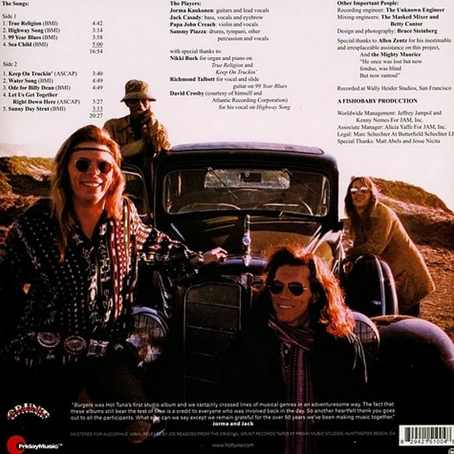 Фірмова вінілова платівка (VINYL)Burgers is the third album by Hot Tuna, the folk rock offshoot of Jefferson Airplane members Jorma Kaukonen, Jack Casady, and Papa John Creach, released in 1972 as Grunt FTR-1004. It was the band's first studio album, the previous two being live recordings. "Water Song" and "Sunny Day Strut" are instrumentals composed for this album.