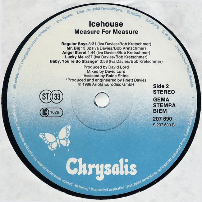 Фірмова вінілова платівка (VINYL)Measure for Measure is the fourth studio album by the Australian rock/synth-pop band Icehouse, released on 21 April 1986 in Australia by Regular Records and in the United States by Chrysalis Records. It was one of the first three albums to be recorded entirely digitally.