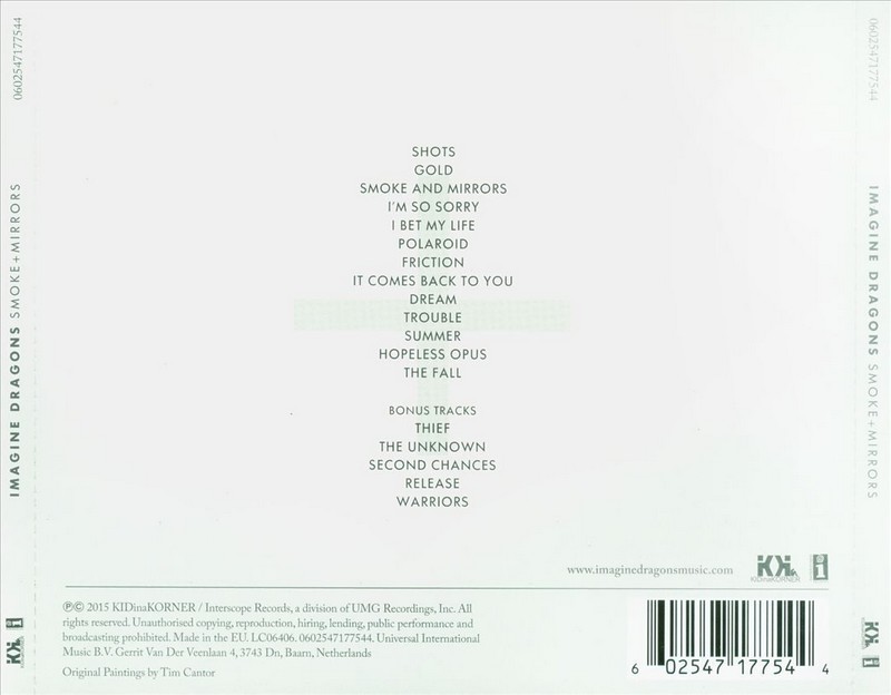 Фірмовий диск (CD)Smoke + Mirrors is the second studio album by American pop rock band Imagine Dragons. The album was recorded during 2014 at the band's home studio in Las Vegas, Nevada. Self-produced by members of the band along with English hip-hop producer Alex da Kid, the album was released by Interscope Records and Grant's Kidinakorner label on February 17, 2015, in the United States.