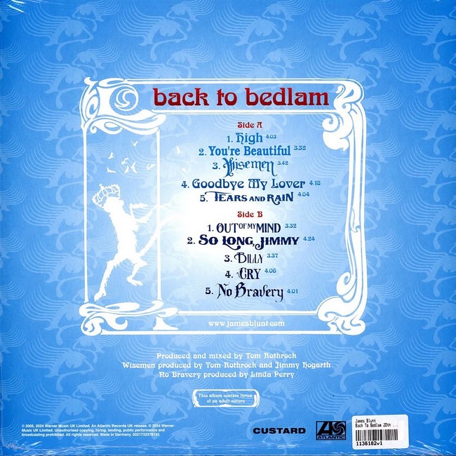 Фірмова вінілова платівка (VINYL)Back to Bedlam is the debut studio album by English singer-songwriter James Blunt, released on 11 October 2004 by Custard and Atlantic Records. It is named after the famous psychiatric institution of Bethlem Royal Hospital in London, which is commonly known as "Bedlam".