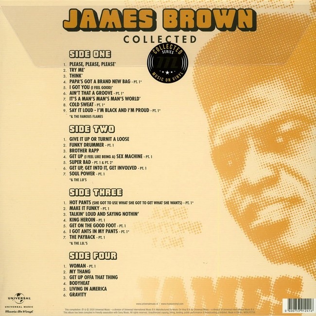 Фірмова вінілова платівка (VINYL)James Joseph Brown (May 3, 1933 – December 25, 2006) was an American singer, dancer and musician. The central progenitor of funk music and a major figure of 20th-century music, he is referred to by various nicknames, among them "the Hardest-Working Man in Show Business", "Godfather of Soul", "Mr. Dynamite", and "Soul Brother No. 1". In a career that lasted more than 50 years, he influenced the development of several music genres. Brown was one of the first 10 inductees into the Rock and Roll Hall of Fame on January 23, 1986.