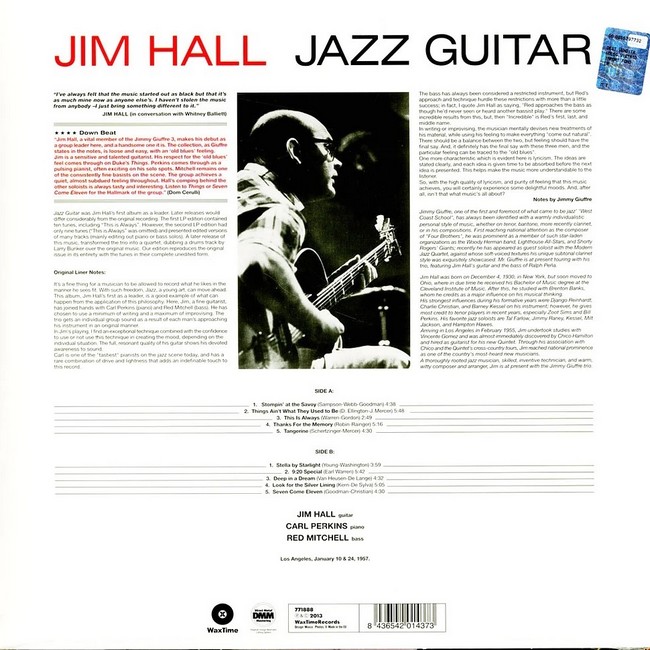 Фірмова вінілова платівка (VINYL)Jazz Guitar is the debut album by jazz guitarist Jim Hall, recorded in early 1957 for the Pacific Jazz label. It is composed mostly of standards. Hall's group for the original recording sessions was a guitar/piano/bass trio, an instrumental combination popularized by Nat King Cole in the 1940s, and previously used by the poll-winning guitarist Tal Farlow on two notable albums recorded in 1956 for Norgran and Verve.