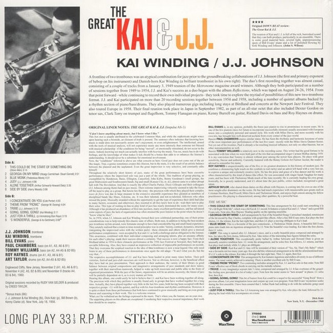 Фірмова вінілова платівка (VINYL)The Great Kai & J. J. is an album by American jazz trombonists Kai Winding and J. J. Johnson featuring performances recorded in 1960 as the first release for the Impulse! label (A-1 for the mono LP, AS-1 for the stereo one).