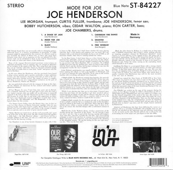 Фірмова вінілова платівка (VINYL)Mode for Joe is the fifth studio album by American jazz saxophonist Joe Henderson, recorded and released in 1966. Featuring Henderson with a larger than usual ensemble consisting of trumpeter Lee Morgan, trombonist Curtis Fuller, vibraphonist Bobby Hutcherson, pianist Cedar Walton, bassist Ron Carter and drummer Joe Chambers, it was Henderson’s last Blue Note recording as leader until the live albums The State of the Tenor, Vols. 1 & 2 almost 20 years later.