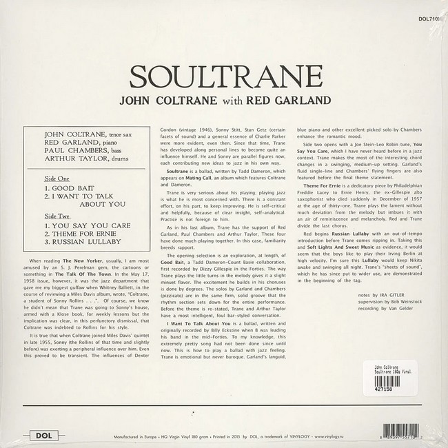 Фірмова вінілова платівка (VINYL)Soultrane is a studio album by the jazz musician John Coltrane. It was released in 1958 through Prestige Records, with catalogue no. 7142. It was recorded at the studio of Rudy Van Gelder in Hackensack, New Jersey, three days after a Columbia Records session for Miles Davis and the Milestones album.