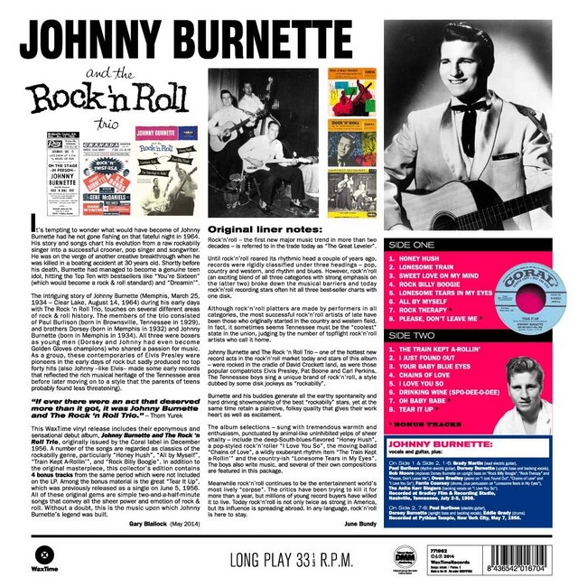 Johnny Burnette and the Rock 'n Roll Trio is the 1956 debut album of the rockabilly band The Rock and Roll Trio, fronted by Johnny Burnette. Recorded over three separate sessions in 1956, the album includes a number of the band's singles. 2008's Icons of Rock calls the album "an all-time rockabilly classic". Released as a 10" LP in the UK by Vogue/Coral Records in December 1956 (#10041), it was released again in 12" format in its US debut by Coral Records in 1957 (#57080) and in 1978 by Solid Smoke (#8001).