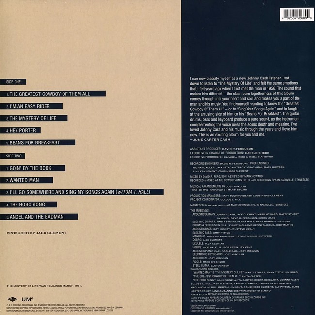 Фірмова вінілова платівка (VINYL)The Mystery of Life is the 77th album by country singer Johnny Cash, released in 1991, and his last for Mercury Records. The songs featured are culled from both recent sessions and from leftovers from Cash's first Mercury session in 1986 for the album Johnny Cash is Coming to Town.