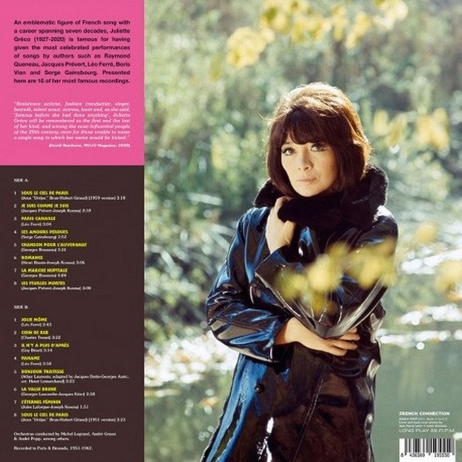 Фірмова вінілова платівка (VINYL)Juliette Greco (7 February 1927 – 23 September 2020) was a French singer and actress. Her best known songs are "Paris Canaille" (1962, originally sung by Leo Ferre), "La Javanaise" (1963, written by Serge Gainsbourg for Greco) and "Deshabillez-moi" (1967). She often sang tracks with lyrics written by French poets such as Jacques Prevert and Boris Vian, as well as singers like Jacques Brel and Charles Aznavour. Her 60-year career concluded with her final worldwide tour titled "Merci", which began in 2015.