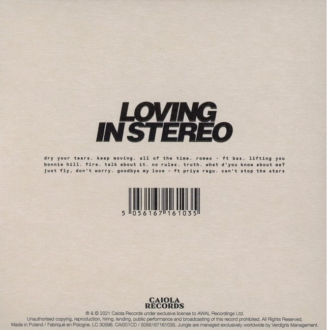 Фірмовий диск (CD)Loving in Stereo is the third studio album by British electronic band Jungle, released on 13 August 2021. It is their first release on their own independent label, Caiola Records, and is marketed and distributed by AWAL (a division of Sony Music).