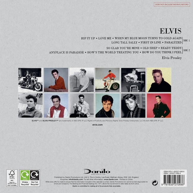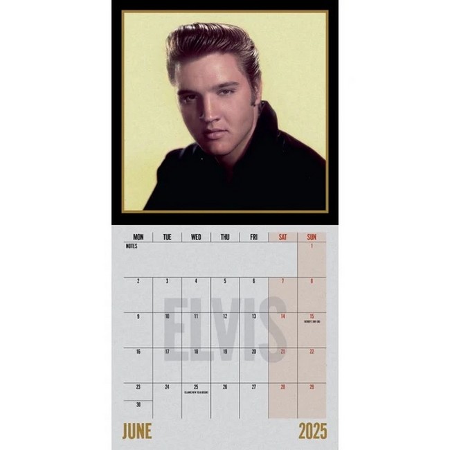 Фірмовий календар на стіну (Calendar)This official calendar is presented in a record sleeve style cover, reminiscent of Elvis Presley's iconic album "Elvis" released in 1956. Each month features incredible young images of Elvis, capturing his timeless charm and charisma. With large monthly date panels, there's ample space to write down all your notes and appointments for 2025. Get ready to celebrate the legacy of the King of Rock 'n' Roll throughout the year!