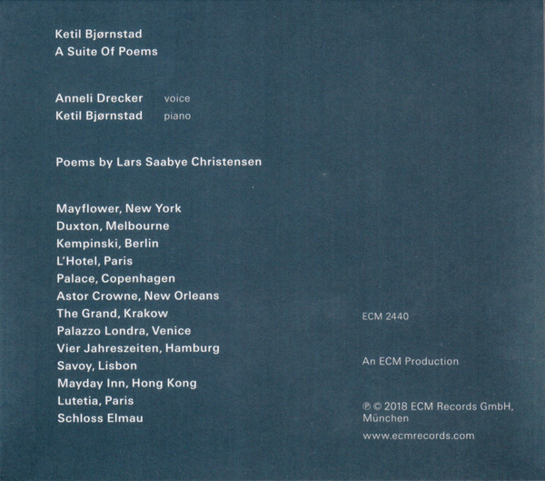 "A Suite Of Poems" был выпущен в 2018 году и оставил заметный след в современном джазе. Этот альбом - символ настоящего музыкального сотрудничества, где пианист Ketil Bjørnstad соединил свои усилия с норвежской певицей Anneli Drecker. Их музыка вдохновлена литературой и переплетена с лирическими, почти поэтическими мелодиями.