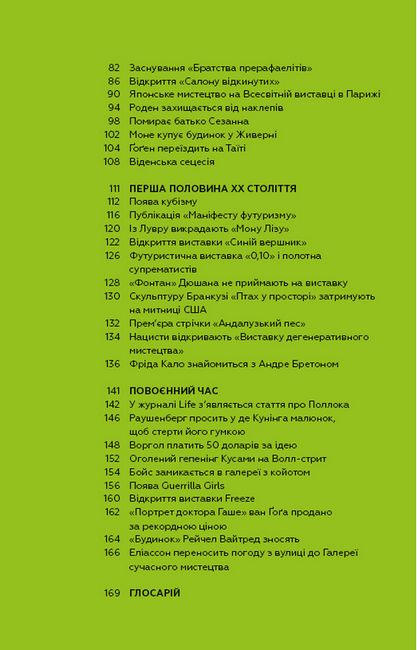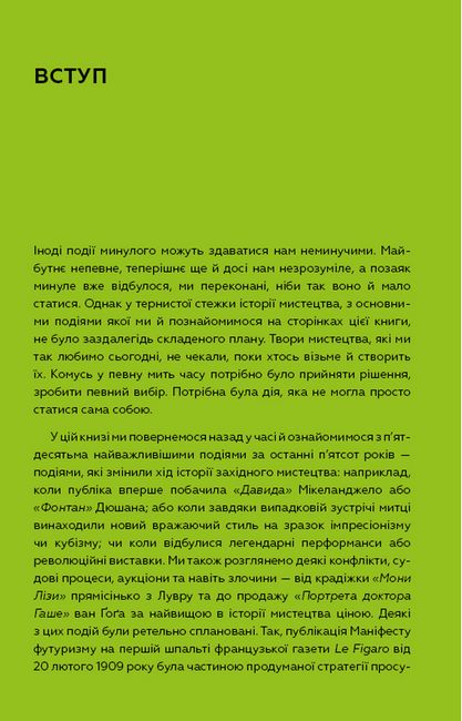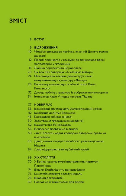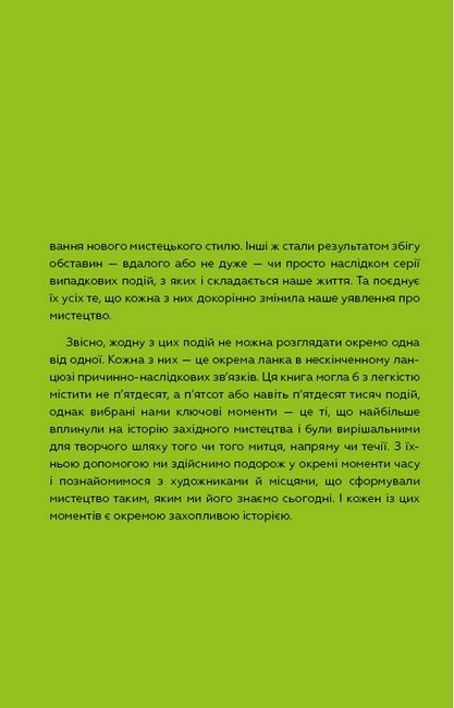 У книзі «Ключові події в мистецтві» читачі можуть познайомитися з п’ятдесятьма віховими подіями зі світу культури живопису — відомими й не дуже — у період від епохи Відродження до сучасності. У книзі цікаво та доступно розповідається про найяскравіші моменти тієї чи тієї епохи — від появи на світ «Давида» Мікеланджело і «Фонтана» Марселя Дюшана до народження нових вражаючих стилів, як-от імпресіонізм і поп-арт, і до сенсаційних виставок.