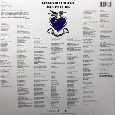 A1 | The Future Arranged By – Leonard Cohen Arranged By [Background Vocals And Strings], Conductor [Background Vocals And Strings] – David Campbell Arranged By [Based On An Arrangement By] – Perla Batalla Drums – Steve Meador Guitar [Guitars] – Bob Metzger Programmed By, Performer – Leonard Cohen, Yoav Goren Tambourine – Lenny Castro Written-By – Leonard Cohen | 6:42 | |