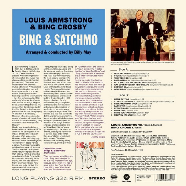 Фірмова вінілова платівка (VINYL)Bing & Satchmo is a 1960 studio album by Bing Crosby and Louis Armstrong that was arranged and conducted by Billy May. The album was recorded for Crosby's label, Project Records, and released by MGM.