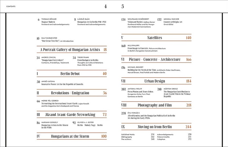 Magyar Modern представляет обзор венгерских художников, работавших на берегах Шпрее во времена Веймарской республики, их вклад в немецкий авангард и культурные связи, которые угасли с приходом к власти нацистов. В этом каталоге, посвященном выставке, представленной Берлинской галереей и Венгерской национальной галереей, представлены работы Эвы Бесньо, Михая Биро, Брассая, Лайоша д'Эбнета, Белы Кадара, Юдит Карас, Лайоша Кассака, Дьёрдя Кепеса, Ласло Мохой-Надя, Мартина. Мункачи, Дьюла Пап, Ласло Пери, Берталан ПорЛайош Тиханьи, Андор Вейнингер и другие.