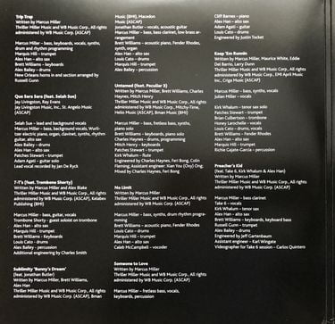 | A1 | Trip Trap Alto Saxophone – Alex Han Arranged By [New Orleans Horns In The End Section] – Russell Gunn Bass, Keyboards, Vocals, Synth, Programmed By [Drum And Rhythm Programming], Written-By – Marcus Miller Drums – Alex Bailey* Keyboards – Brett Williams (8) Trumpet – Marquis Hill | 6:55 | |