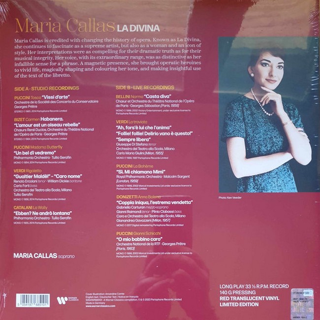 Фірмова вінілова платівка (VINYL)Greek-American operatic soprano, born in New York on 1923-12-04, died in Paris on 1977-09-16. Her musical and dramatic talents led to her being hailed as La Divina.
