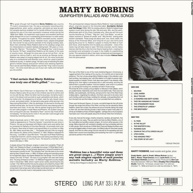 Фірмова вінілова платівка (VINYL)Gunfighter Ballads and Trail Songs is the fifth studio album by Marty Robbins, released on the Columbia Records label in September 1959 and peaking at number 6 on the U.S. pop albums chart. It was recorded in a single eight-hour session on April 7, 1959, and was certified Gold by the RIAA in 1965 and Platinum in 1986. It is perhaps best known for Robbins's most successful single, "El Paso," a major hit on both the country and pop music charts, as well as for its opening track, "Big Iron," a song that gained a resurgence in popularity online as an Internet meme after its inclusion in the 2010 video game Fallout: New Vegas.