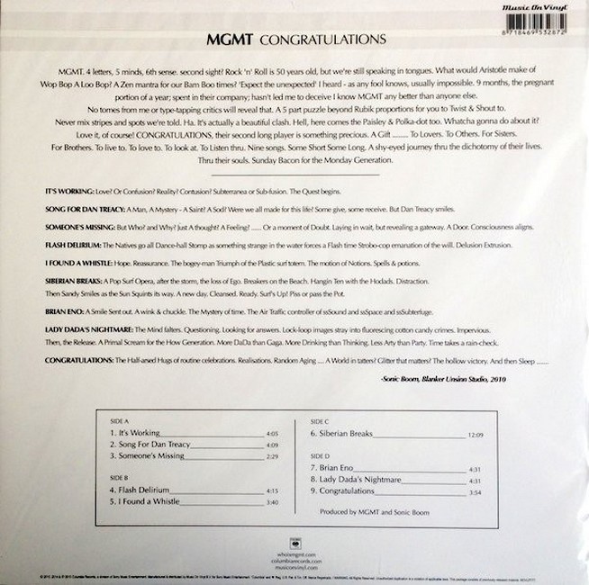 Фірмова вінілова платівка (VINYL)Congratulations is the second studio album by American rock band MGMT. It was initially made available for free streaming through the band's website on March 20, 2010, prior to its official release on April 13 through Columbia Records. The album marks a departure from the synth-pop style that brought MGMT acclaim on their debut, Oracular Spectacular, released three years prior, and features a more psychedelic, progressive and guitar-driven sound.