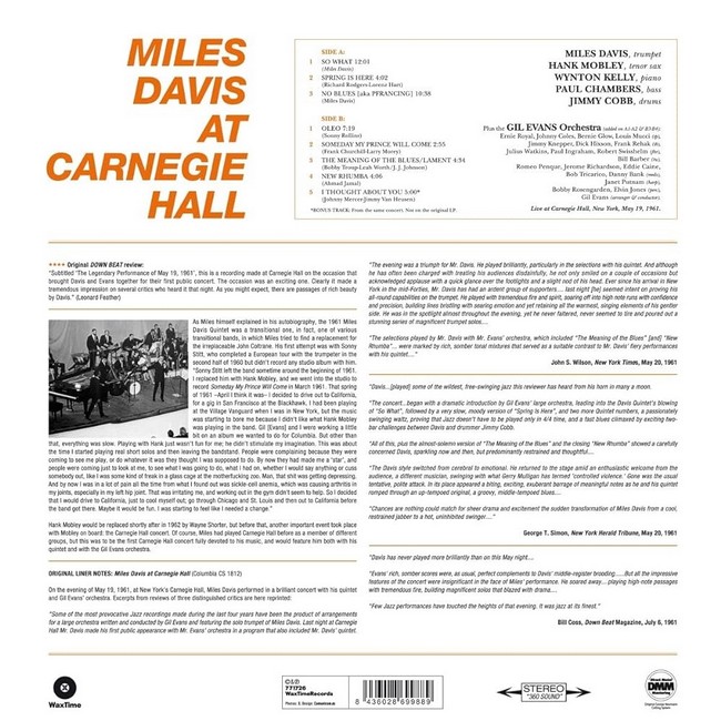 Фірмова вінілова платівка (VINYL)Miles Davis at Carnegie Hall: The Legendary Performances of May 19, 1961 is a live album by American jazz musician Miles Davis originally released by Columbia in 1962.