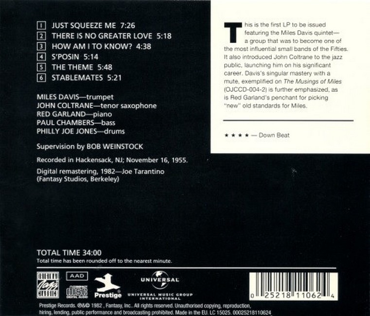 Фірмовий диск (CD)Miles: The New Miles Davis Quintet is a studio album by the jazz musician Miles Davis which was released in April 1956 through Prestige Records. It is the debut record by the Miles Davis Quintet, and generally known by the original title Miles as indicated on the cover.