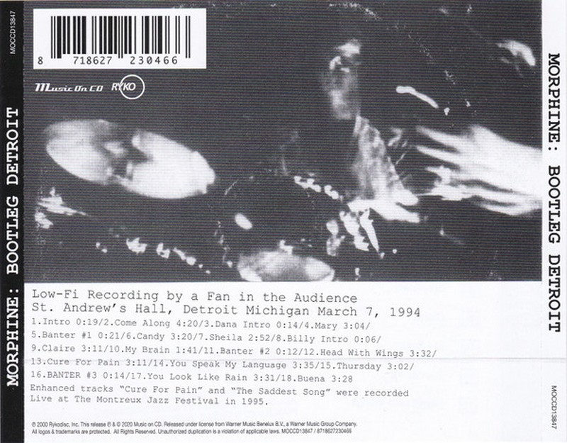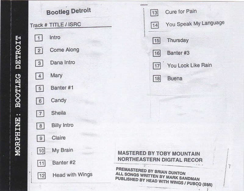 Фірмовий CD диск (CD)Bootleg Detroit is the only authorized release of a live recording of Morphine. It was released on the label Rykodisc in September 2000. Recorded by Alan J. Schmit—a fan—on March 7, 1994, at St. Andrew’s Hall in Detroit, Michigan, it was edited and mixed under Mark Sandman’s supervision. He also laid out and delivered the low-fi artwork for the album prior to the band’s final tour in Italy.