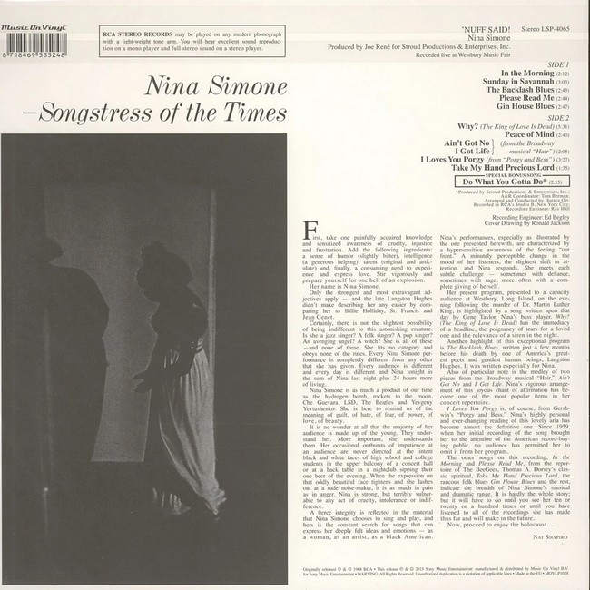 Фірмова вінілова платівка (VINYL)'Nuff Said! is an album by jazz singer/pianist/songwriter Nina Simone. It was recorded—excluding tracks 1, 8, and 11—at Westbury Music Fair, April 7, 1968, three days after the murder of Martin Luther King Jr. The whole program that night was dedicated to his memory. The album featured one of Simone's biggest hits in Europe, "Ain't Got No, I Got Life".
