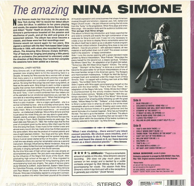 Фірмова вінілова платівка (VINYL)The Amazing Nina Simone is the second studio album by Nina Simone, released in July 1959. It was her second album, and her first recording for Colpix Records. The album contains a variety of material, including jazz, gospel, and folk songs. Compared to her debut, which showcased Simone's piano playing ability in addition to her singing, the piano was downplayed on Amazing in favor of string arrangements.