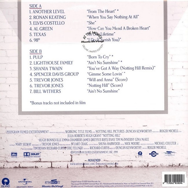 Фірмова вінілова платівка (VINYL)Notting Hill: Original Motion Picture Soundtrack is the soundtrack to the 1999 film of the same name released by Island Records on 17 May 1999 in United States and 24 May in United Kingdom and rest of Europe. The album featured 13 tracks in each versions that are varied from each album; it includes songs performed by Shania Twain, Elvis Costello, Bill Withers, Al Green, 98°, Steve Poltz amongst several others. It also featured incidental underscore composed by Trevor Jones with one of his cues that was in the film, had been split into two songs for the soundtrack, along with excerpts of Jones' score being used throughout the film. The album was made available in CDs and cassettes on its initial release, while a vinyl edition of the album was released on 28 May 2019, 20 years after the film's original release. It received a Brit Award for Best Soundtrack in 2000.