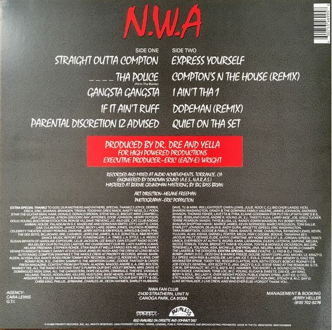 Фирменная виниловая пластинка (VINYL)Straight Outta Compton is the debut studio album by American hip hop group N.W.A, which, led by Eazy-E, formed in Los Angeles County's City of Compton in early 1987. Released by his label, Ruthless Records, on August 8, 1988,[1] the album was produced by N.W.A members Dr. Dre, DJ Yella, and Arabian Prince, with lyrics written by N.W.A members Ice Cube and MC Ren along with Ruthless rapper The D.O.C. Not merely depicting Compton's street violence, the lyrics repeatedly threaten to lead it by attacking peers and even police. The track "Fuck tha Police" drew an FBI agent's warning letter, which aided N.W.A's notoriety, with N.W.A calling itself "the world's most dangerous group."