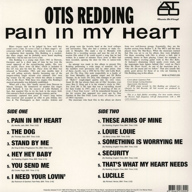 Фірмова вінілова платівка (VINYL)Pain in My Heart is the debut album of soul singer-songwriter Otis Redding. Redding recorded for Volt Records, a subsidiary of Stax Records, based in Memphis, Tennessee. Volt LPs were initially issued on the Atco label, which released this album (the singles were issued on the Volt label).