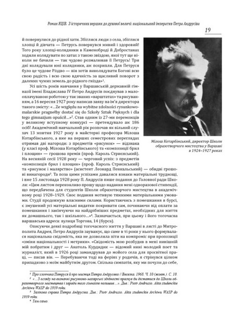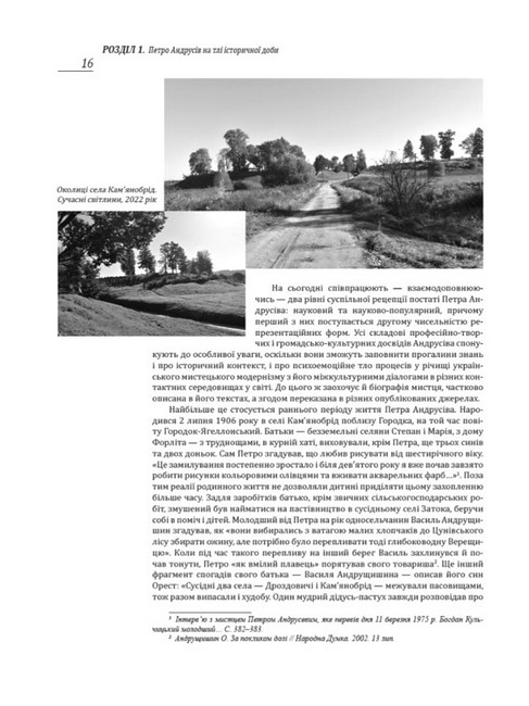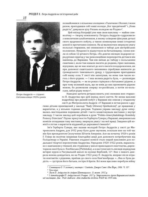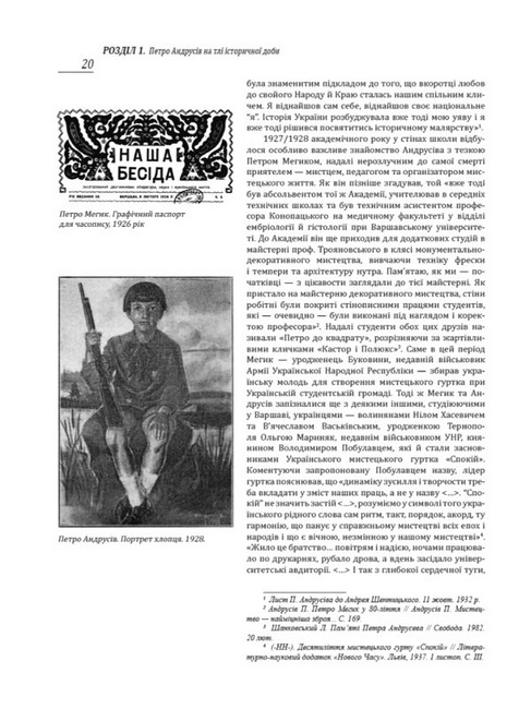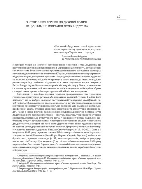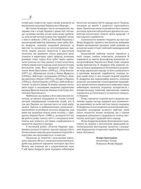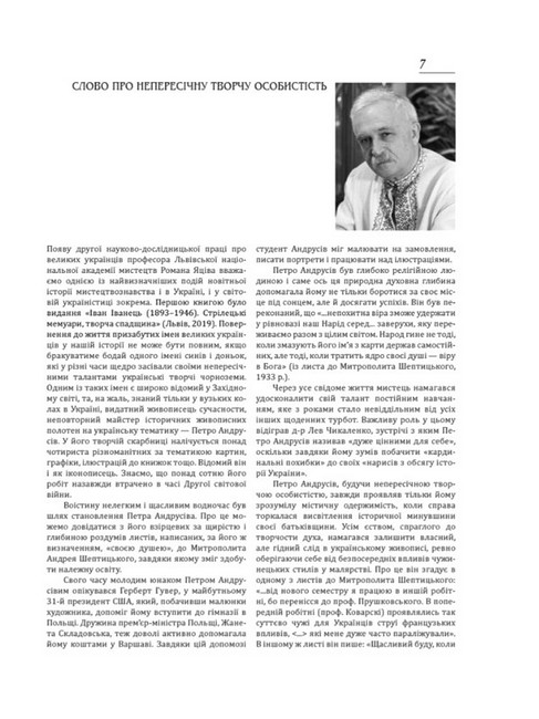 У виданні представлено різнобічну творчу та науково-публіцистичну спадщину визначного українського мистця та громадсько-культурного діяча Петра Андрусіва: репродукції малярських і графічних творів, найбільш значимі за змістом, ідейним і теоретичним наповненням мистецтвознавчі тексти, а також вибрані листи, зокрема до Митрополита Андрея Шептицького. Уперше в українському мистецтвознавстві здійснена наукова реконструкція творчої біографії мистця, проаналізовано мистецьку та науково-публіцистичну спадщину, особливу увагу звернено на громадсько-культурну та ідейно-творчу іпостасі діяльності Петра Андрусіва. Видання доповнює каталог творів художника, бібліографія статей Андрусіва та публікацій про нього, а також світлини з родинного життя художника. Для мистецтвознавців, культурологів, практиків мистецтва, істориків, педагогів, аспірантів, студентів, а також усіх, кого цікавить історія мистецтва та національна культурна спадщина.