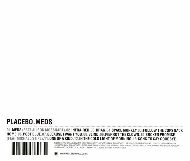 Фірмовий диск (CD)Meds is the fifth studio album by British alternative rock band Placebo. It was recorded from late 2005 to early 2006 and released on 13 March 2006 by record label Virgin in most countries, although it was released three days earlier in Australia and New Zealand. Illegal copies had previously been available on the Internet since 17 January 2006.
