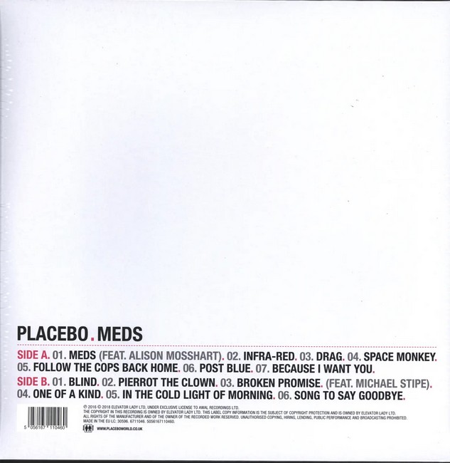 Фірмова вінілова платівка (VINYL)Meds is the fifth studio album by British alternative rock band Placebo. It was recorded from late 2005 to early 2006 and released on 13 March 2006 by record label Virgin in most countries, although it was released three days earlier in Australia and New Zealand. Illegal copies had previously been available on the Internet since 17 January 2006.