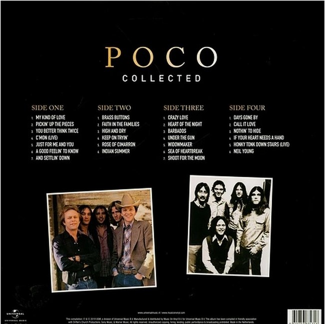 Фірмова вінілова платівка (VINYL)Poco was an American country rock band originally formed in 1968 after the demise of Buffalo Springfield. Guitarists Richie Furay and Jim Messina, former members of Buffalo Springfield, were joined by multi-instrumentalist Rusty Young, bassist Randy Meisner, and drummer George Grantham. Meisner quit the band while they were recording their first album, Pickin' Up the Pieces, though his bass and backing vocal parts were kept in the final mix. He was replaced by Timothy B. Schmit in 1969, and Messina left in 1970 to be replaced by Paul Cotton. The line-up would change numerous times over the next several decades, with Rusty Young being the only constant member. A reunion of the founding members occurred in the late 1980s-early 1990s, and the band has continued in some form through 2021, though they retired from active touring in 2013, with Young citing health concerns as the primary cause of his retirement. Young died from a heart attack in April 2021.