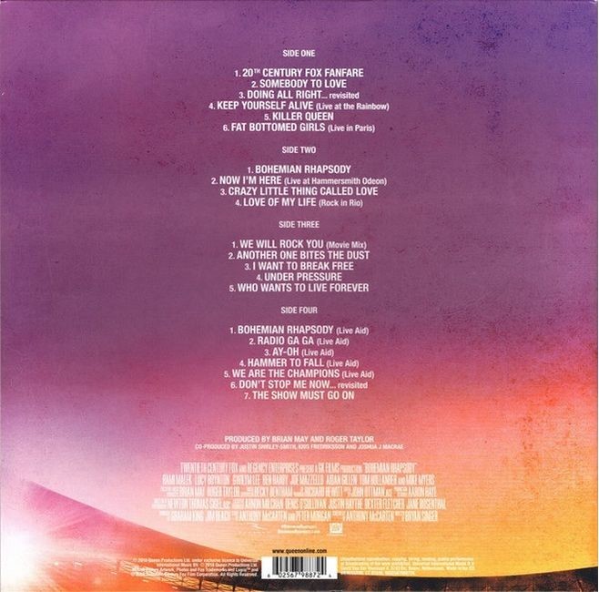 Фірмова вінілова платівка (VINYL)Bohemian Rhapsody: The Original Soundtrack is the soundtrack album to the Queen biographical film of the same name. The soundtrack features many of the band's songs and unreleased recordings including tracks from their legendary concert at Live Aid in 1985. The soundtrack was released by Hollywood Records and Virgin EMI Records on 19 October 2018, on CD, cassette and digital formats.