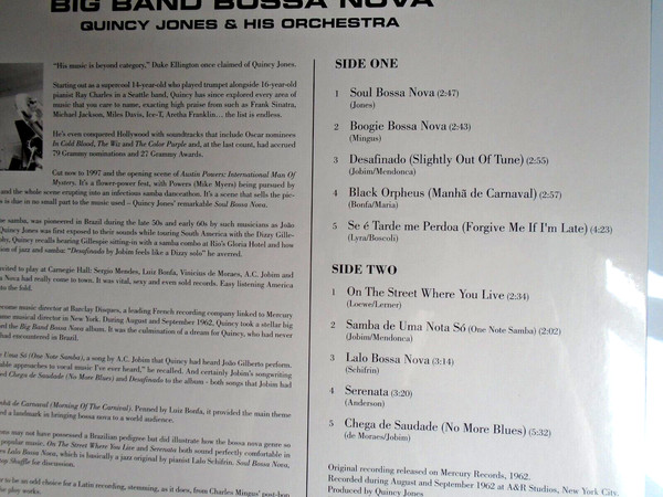 Оригинальный альбом "Big Band Bossa Nova" был выпущен в начале 1960-х, и с тех пор его мелодии стали вечной классикой. В этом альбоме Куинси Джонс сумел гениально соединить американский джаз с бразильскими ритмами босса-новы, создав уникальное звучание, которое вы сразу узнаете и полюбите. Этот релиз вновь порадует вас известными композициями такими как "Soul Bossa Nova", мелодия которой известна миллионам благодаря кинематографу.