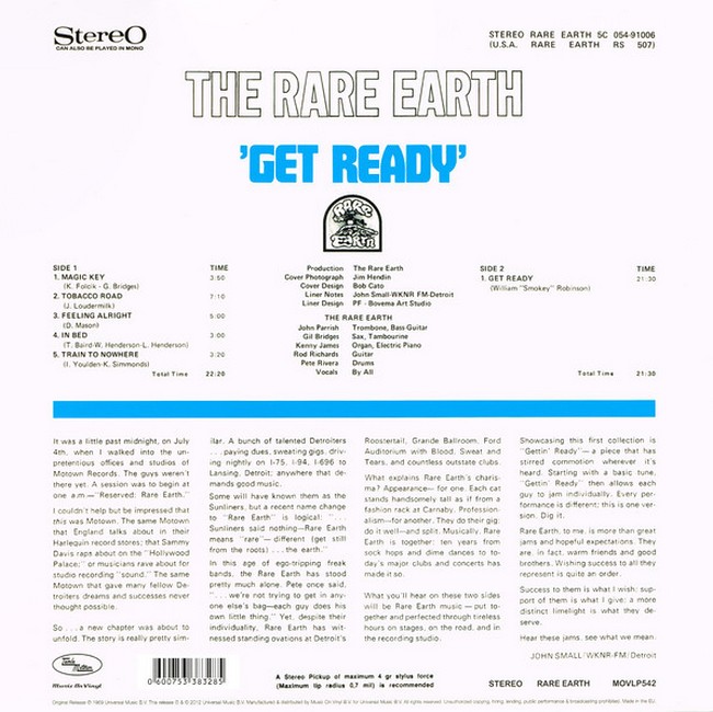 Фірмова вінілова платівка (VINYL)Get Ready is the RIAA Platinum-certified second studio album by American rock band Rare Earth. Released on September 30, 1969, it was one of five albums that launched the Motown subsidiary Rare Earth Records, named after the band.
