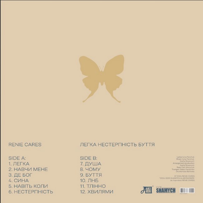 Фірмова вінілова платівка (VINYL)Інді-роковий гурт Renie Cares складається з двох українських музикантів^ вокалістки Ірини Панчук та продюсера Олександра Мусевича. Ірина народилася та виросла в Старокостянтинові, у 17-річному віці рік прожила в Миколаєві, навчаючись в Українській академії лідерства, а потім переїхала до Києва[2], вступивши до Києво-Могилянської академії.