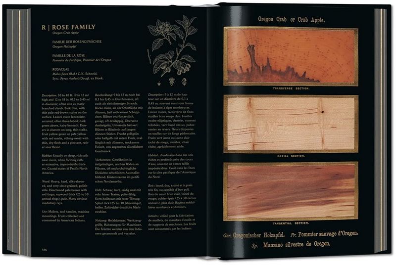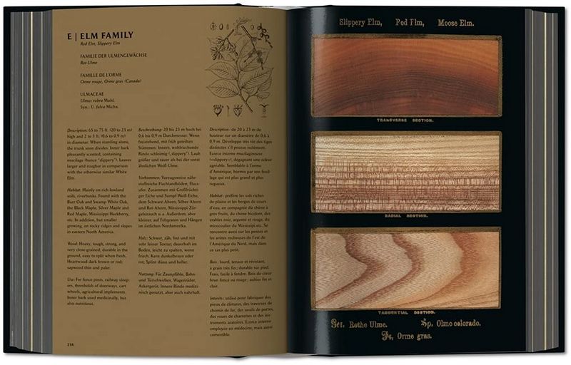 Culled and assembled by Romeyn Beck Hough between 1888 and 1913 in what still remains a stunning and unparalleled achievement, American Woods?originally published in 14 volumes, with actual specimens mounted on card stock?is a work of breathtaking beauty that has set the standard for the study of trees and wood.The Woodbook reproduces, in painstaking facsimile, all of the specimen pages from the original volumes; for this purpose, TASCHEN obtained an extremely rare original set of volumes in very good condition, with minimal damage to the wood cuts. Arranged in alphabetical order, each tree is broken down into three different cross-section cuts of wood (radial, horizontal, and tangential), demonstrating the particular characteristics of the grain and the wealth of colors and textures to be found among the many different wood types.