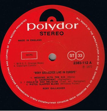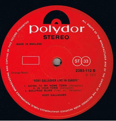 Live! in Europe is the third album by Irish blues guitarist Rory Gallagher, released in 1972. It is a series of live recordings made during his European tour that year. Unusual for a live album, it contains only two songs previously recorded and released by Gallagher ("Laundromat" and "In Your Town"). The other songs are either new Gallagher songs or Gallagher's interpretation of traditional blues songs.