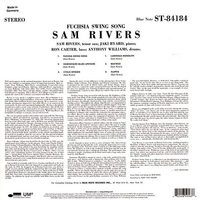 Фірмова вінілова платівка (VINYL)Fuchsia Swing Song is the debut album by American saxophonist Sam Rivers recorded in 1964 and released on the Blue Note label.The album was reissued on CD in 1995, and again in 2003 as part of the "Connoisseur Series" (limited edition series) including four alternate takes as bonus tracks.